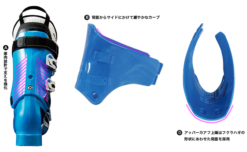 ターン後半におけるカカトへの荷重 でスキーの加速を容易にするためブーツ背面のシェル肉厚を増し、しっかりとした支えを実現。